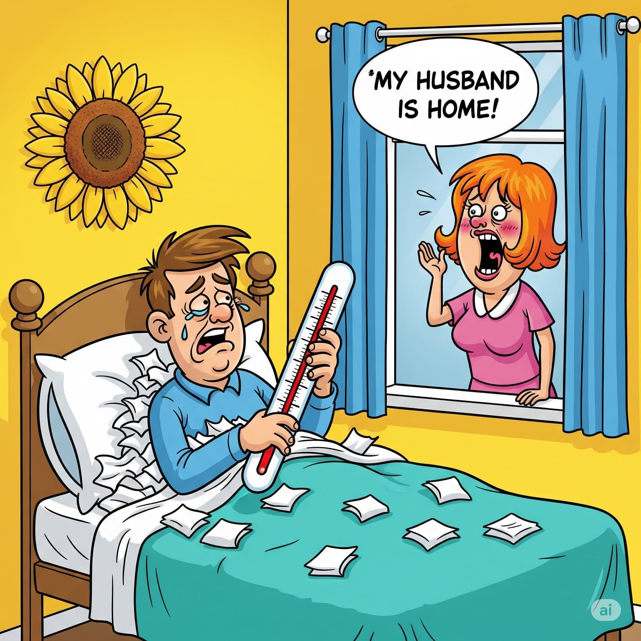Un homme, cloué au lit par une grosse grippe, reçoit la visite d’un ami. Il rayonne malgré la fièvre :