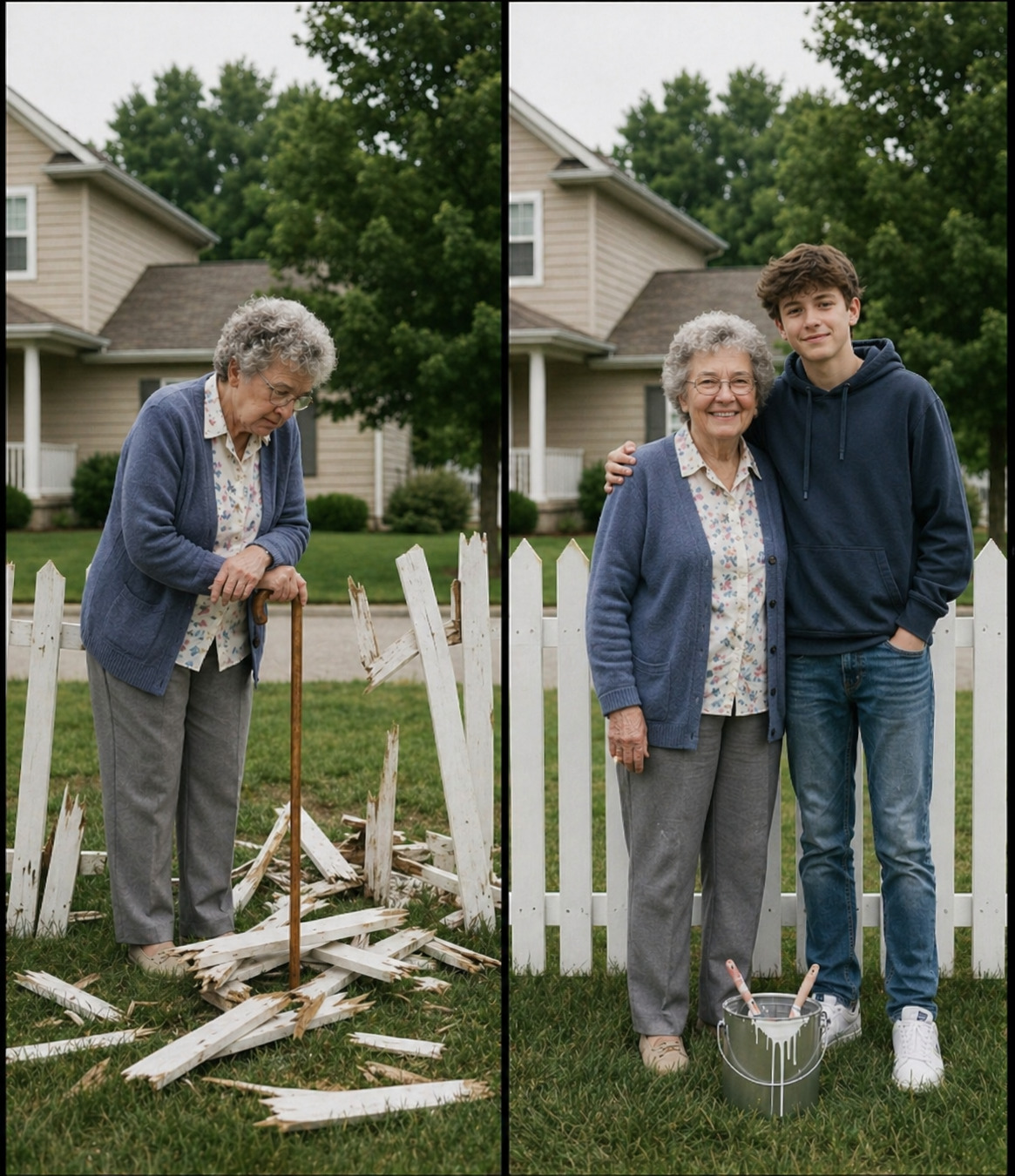 Après le passage d’une tempête particulièrement violente, le quartier portait encore les traces du chaos : branches cassées, clôtures abîmées, jardins en désordre. Sans qu’on le lui demande, mon fils a pris l’initiative d’aller aider notre voisine âgée, dont la clôture avait été endommagée.