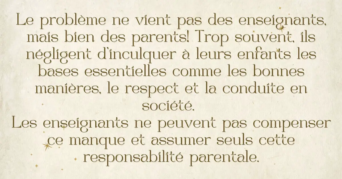Clarifions un point : les enseignants ne sont pas le problème. Le véritable enjeu réside dans le rôle des parents. Il est crucial que les enfants apprennent chez eux les bonnes manières, le respect et la façon de se comporter en société.