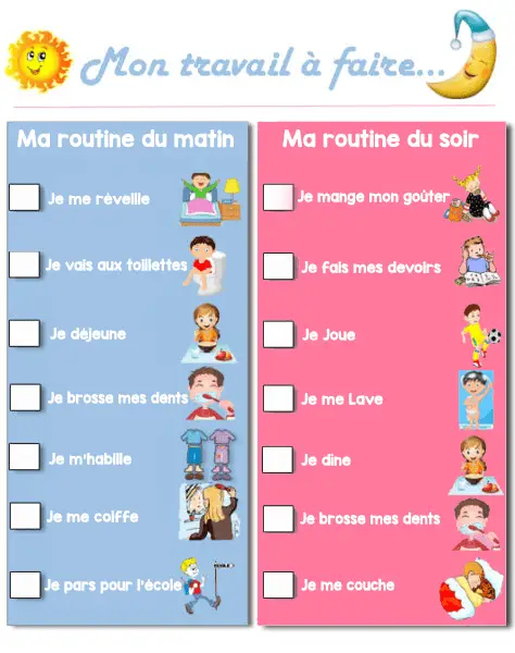 Pour vous faciliter la tâche nous avons créer une routine visuelle (en forme de check-list) , tous que vous avez à faire est d’imprimer ce visuel et le mette dans la chambre de vos enfants et à chaque fois que votre enfant complète ces tâches, vous devez le récompenser et comme ça votre enfant sera motivé.
