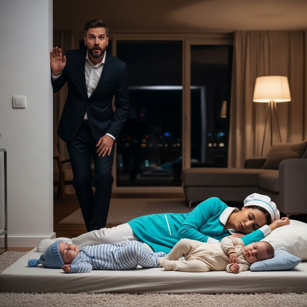 Intrigué, il avança prudemment, ses chaussures élégantes amorties par l’épais tapis. Et soudain, il s’arrêta net. Là, sur le sol, sous la lueur tamisée d’une lampe, une jeune femme en uniforme turquoise dormait profondément. Ses cils effleuraient ses joues, ses traits trahissaient une fatigue immense. À ses côtés, blottis contre elle comme s’ils avaient trouvé refuge, se trouvaient les précieux jumeaux d’Ethan. L’un d’eux tenait fermement le doigt de la jeune femme, l’autre reposait paisiblement contre sa poitrine.