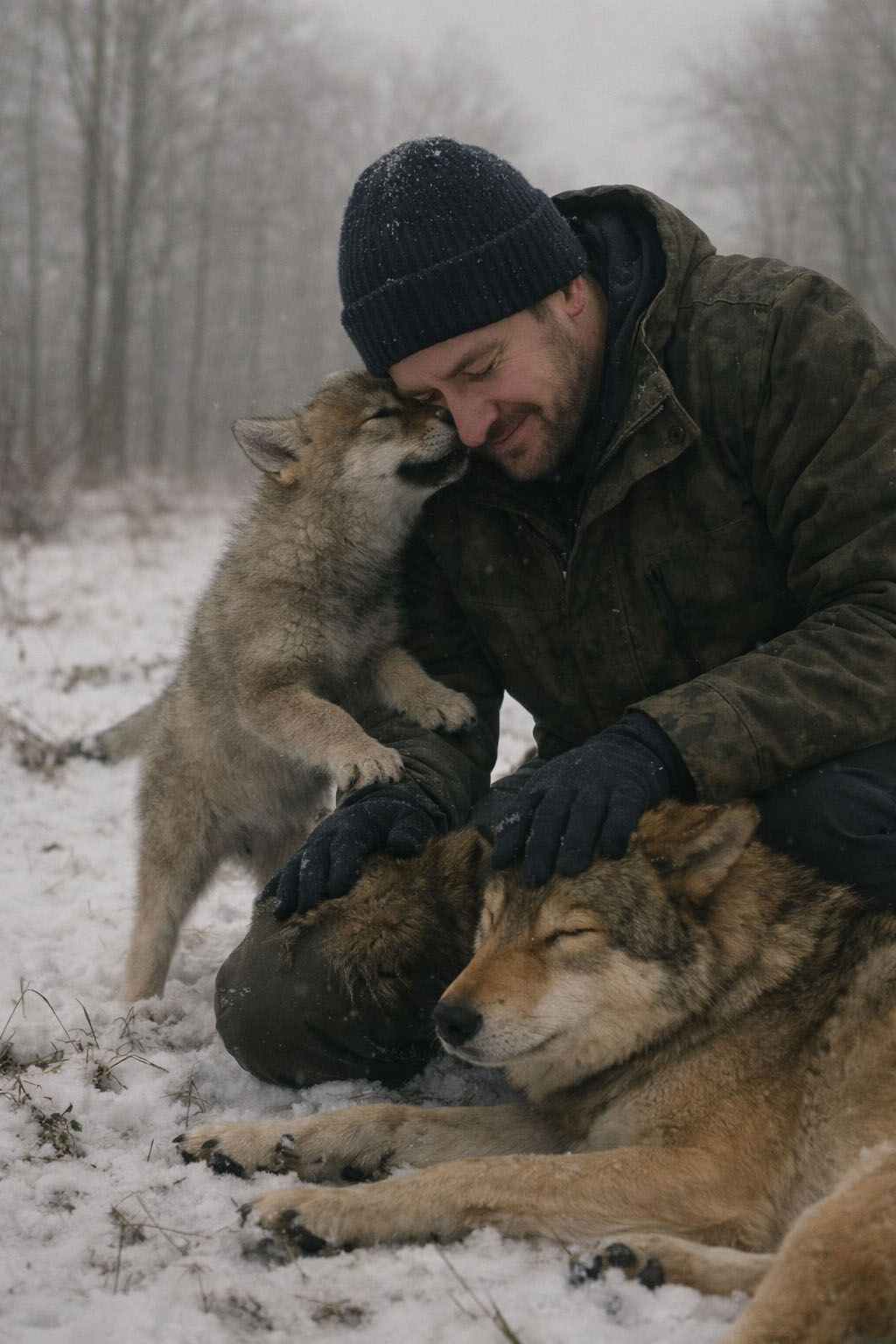 Ce jour-là, alors qu’il progressait lentement sur un sentier gelé et désert, un détail attira son regard : une silhouette sombre, presque fondue dans le blanc du paysage. En s’approchant avec prudence, il découvrit une louve en détresse, allongée dans la neige, et un louveteau agité qui tournait autour d’elle. Son instinct lui criait de rester à distance – tout le monde sait qu’un animal sauvage blessé peut être imprévisible. Mais quelque chose en lui refusa d’ignorer cette scène.