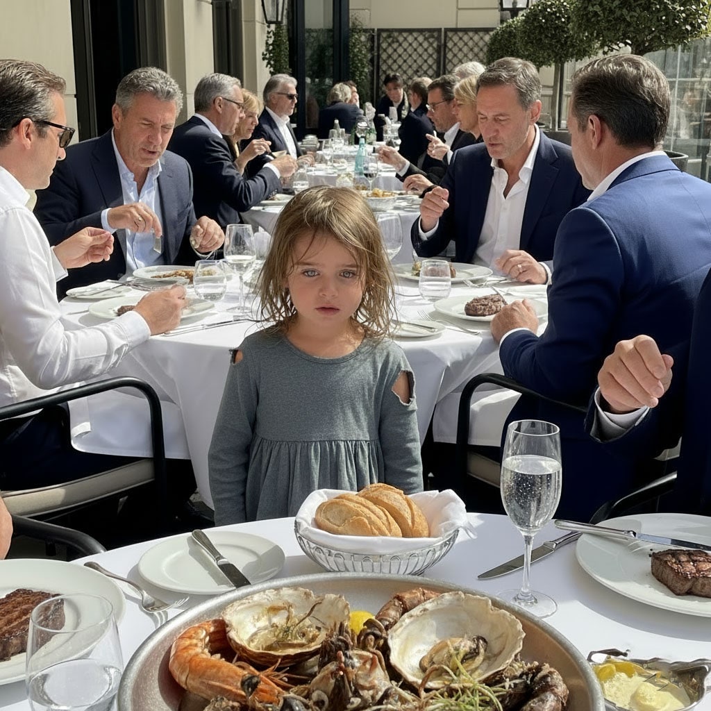 Le temps sembla suspendu. Face à lui se tenait une enfant au visage marqué par la fatigue, les joues creuses, les yeux immenses. Derrière ce regard se lisait toute la dureté d’une enfance abîmée par la rue. À cet instant, Julien a posé ses couverts… et ouvert son cœur.