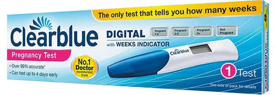 Comment utiliser ce test? : Tout d’abord, mettez Clearblue Digital dans le jet d’urine pendant 5 secondes, le sablier clignote pour montrer que le test fonctionne. Ensuite, attendez 3 minutes et le résultat apparaîtra. La lecture de résultat sera facile, » pas enceinte « , » enceinte 1-2 « , » enceinte 2-3 « , » enceinte 3+ « . Les chiffres sont l’estimation de la grossesse en nombre de semaines.