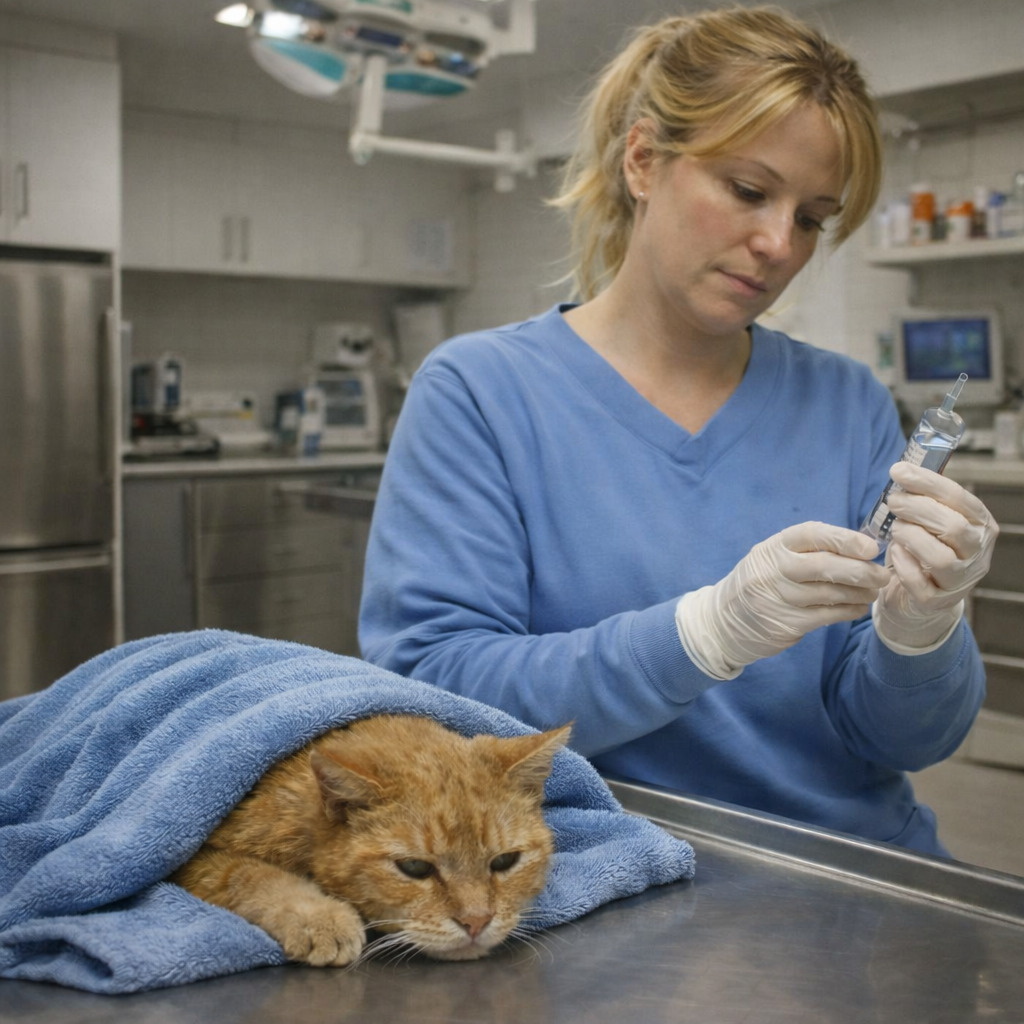 À 15 h 58, la seringue était déjà prête dans ma main. Sur la table d’examen, un vieux chat roux respirait lentement, enveloppé dans une couverture du refuge.