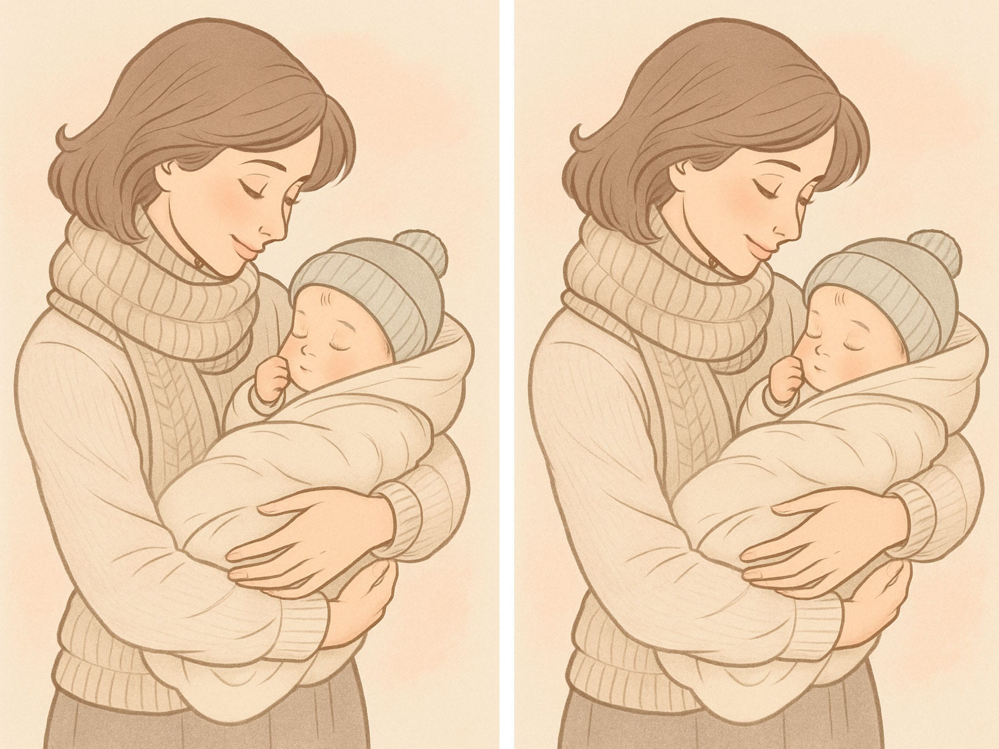 Voici la réponse tant attendue : la variation se trouve au niveau de la couverture du bébé. Sous le bras de la mère, sur l’image de droite, un pli supplémentaire apparaît, invisible sur celle de gauche. Un détail minuscule… mais imparable !