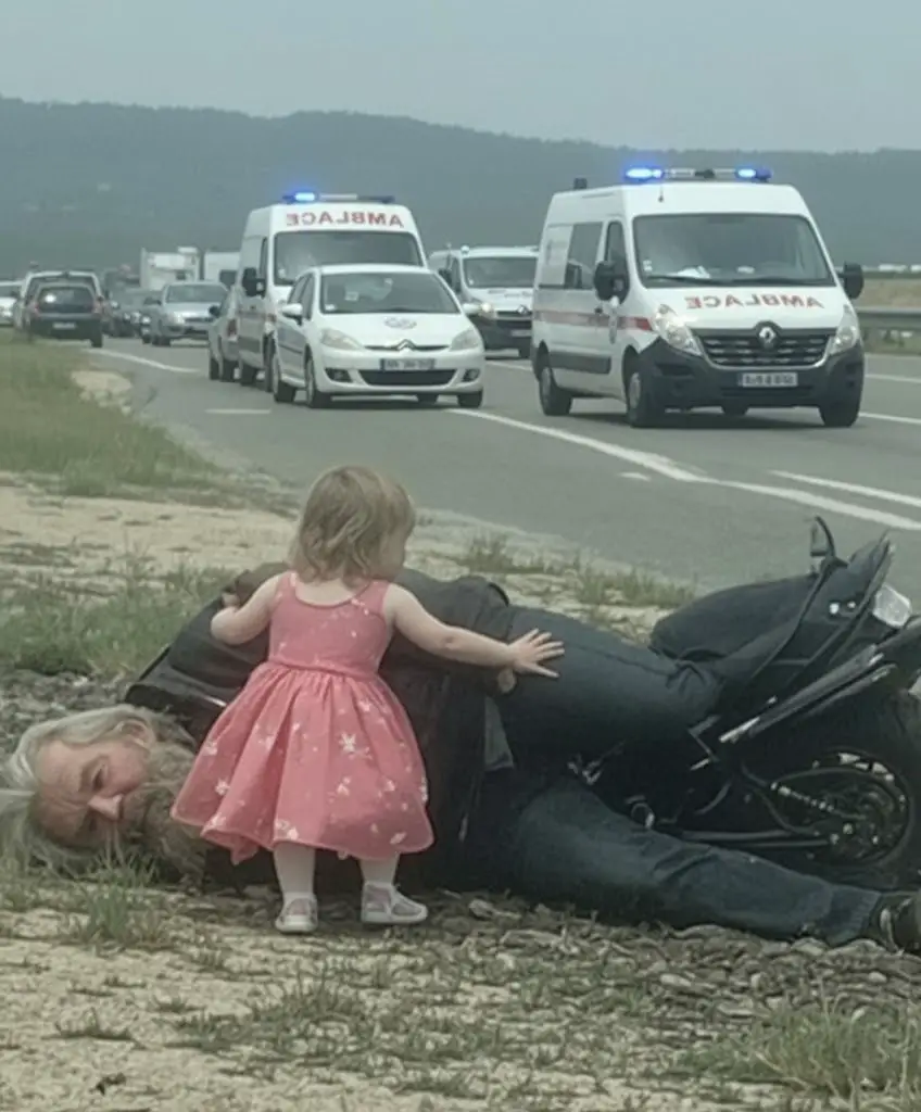 Sa mère, intriguée, scruta les alentours : rien ne semblait indiquer un danger. Pourtant, la petite fille insista avec des détails étonnants — un accident de moto, un blouson en cuir, des traces de sang — comme s’ils avaient été dictés par une vision.